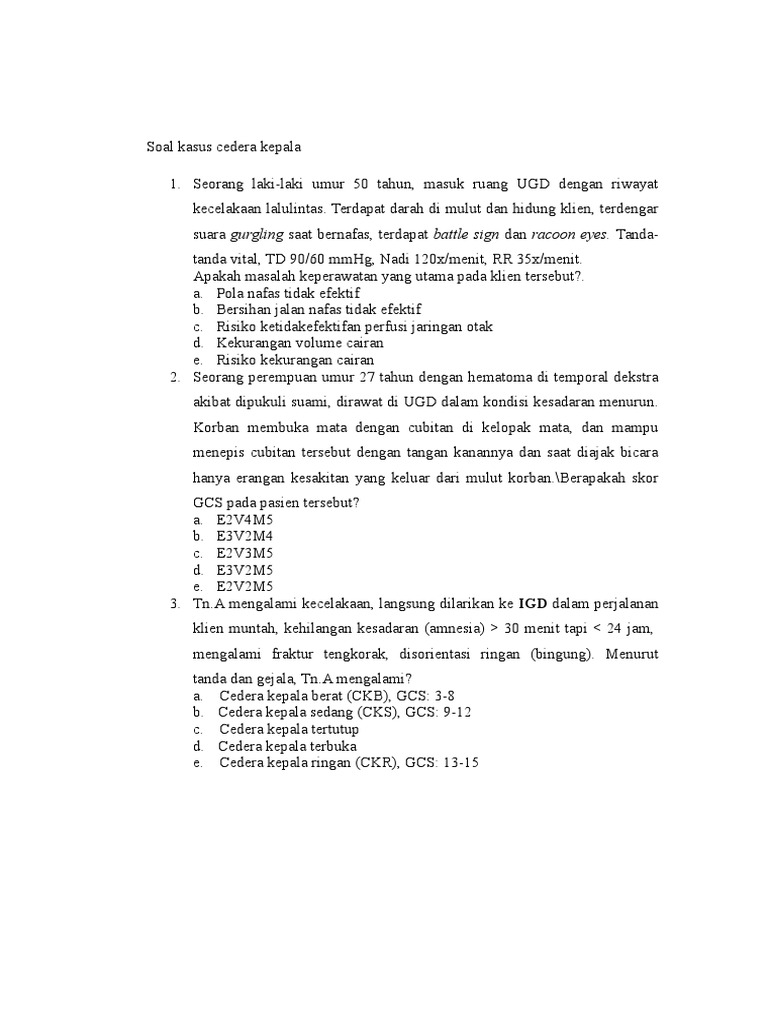 Perawat menilai bahwa klien dapat memahami tanda dan gejala mencegah peningkatan tik jika dalam observasi klien dapat melakukan aktivitas mana? Dalam pertanyaan calon kepala desa yang saya bagikan berisi materi seputar pemerintahan dan pengetahuan umum. Foto dan update status w.a. Silahkan klik pada judul artikel berikut untuk mendapatkan penjelasan lengkap seputar contoh soal kasus cedera kepala yang anda perlukan. Trauma kepala berat dan gcs = 7 kunci jawaban: